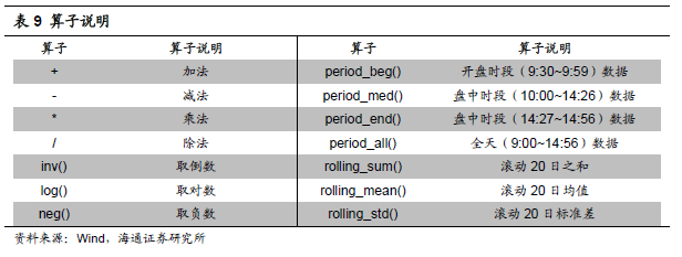 最后,我们可将正交剔除常规低频因子后的因子ICIR作为因子挖掘的目标。在实际的操作过程中,投资者既可参考《金融科技(Fintech)和数据挖掘研究(三)——量化因子的批量生产与集中管理》中提供的因子挖掘方法,也可使用基因规划等方法进行挖掘, python中有较多开源包能够高效实现特征工程。下表展示了部分挖掘得到的因子信息。