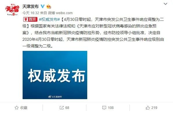 在4月29日北京市宣布防控措施下调到二级的同时,天津、河北等地区也纷纷将防控措施下调为二级。据天津市人民政府新闻办公室官方微博消息,根据国家有关法律法规和《天津市应对新型冠状病毒感染的肺炎应急预案》,结合当前新冠肺炎疫情防控形势,经市防控领导小组批准,决定自2020年4月30日零时起,天津市新冠肺炎疫情防控突发公共卫生事件响应级别由一级调整为二级。