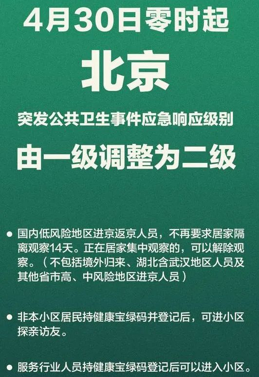 4月29日,北京人民普大喜奔!终于防控级别降低到二级。当日,天津、河北等地也纷纷宣布防控级别降低到二级。根据调整要求,对国内低风险地区进京出差、返京人员,不再要求居家隔离14天,正在隔离观察的可以解除观察。