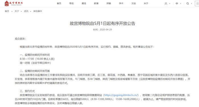 4月29日晚间,故宫博物院网站发布消息,自2020年5月1日起有序开放,实行预约、错峰、限流参观。