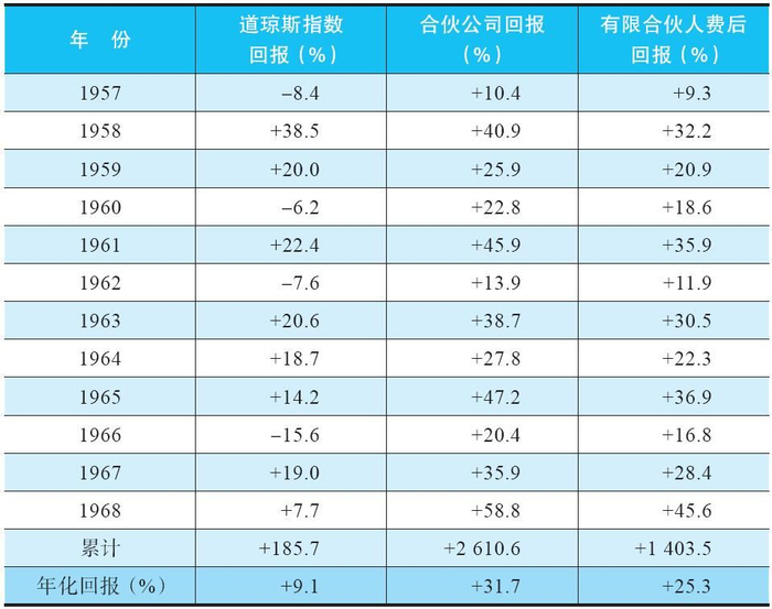 需要说的是,巴菲特是根据投资绩效分成(比例相当高),1957 年-1968 年期间,合伙公司平均年化回报 31.7%,是道指的三倍多。