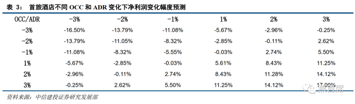 主要弹性测算假设:(1)假设所有直营门店当前的净利率水平约为8%;(2)假设所有加盟店的加盟费为总流水的8.5%,公司净利率约为总流水的5.5%;(3)假设所有在2020年新开的门店和关闭的门店的经营时长均为6个月;(4)根据单店的成本结构进行测算,占总营收26%~28%的成本为可变成本,随单店营收变化同比例变化;(5)假设公司在加盟店的净利率不因RevPAR变化而变化;(6)由于考虑到直营店和加盟店之间经济型和中高端所占比例不同,根据测算,根据2019年报和2018年报,经济型酒店平均单店客房101间,均价170元,出租率84%;中高端酒店平均单店客房120间,均价308元,出租率77.1%。综合测算,假设2020年直营店平均单店营收为X,则加盟店平均单店营收约为1.09X;(7)根据2020年开店和关店预测,则2020年持续营业一年的加盟店为3410家,直营店为660家。