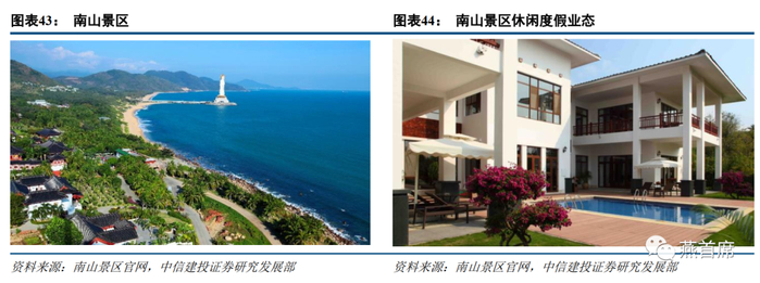 公司旗下亦包含景区业务,南山景区位于旅游胜地海南三亚,公司海南南山景区运营主要通过景区的门票、餐饮、商品、住宿、园区内交通等获得收入利润。公司控股74.81%的南山景区为公司唯一经营的5A级景区。2019年景区运营业务实现营业收入4.5亿元,与2018年基本持平,景区运营业务实现利润总额1.74亿元,同比约下降2%。南山景区的运营相对已较为成熟,营收和利润贡献相对趋于稳定。南山景区作为公司在海南地区的重点布局,未来或主要受益于海南自贸港建设所带来的政策预期和入岛人次的提升红利,海南整体旅游环境和营商环境的改善,对于提升南山景区客流以及消费转化率,降低运营成本有较为确定的预期。