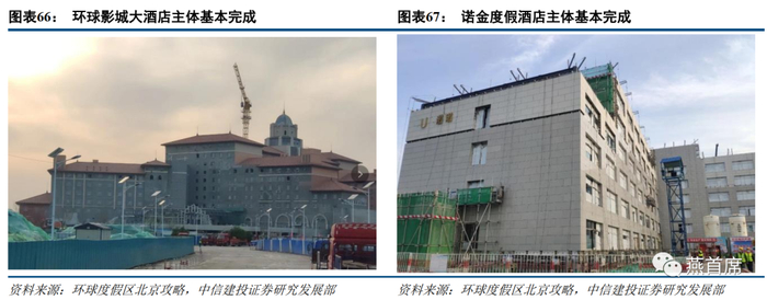 2020年初国内发生新冠疫情,但在做足疫情防控措施的同时,环球影城度假区也开始积极复工,加快进度,目前整体的建设进度仍然较符合预期,预计2021年有较大概率实现开业,园区内主要的游乐设施多数已完成主体建设,同时两大酒店,环球影城大酒店和诺金度假酒店主体已基本完成建设。