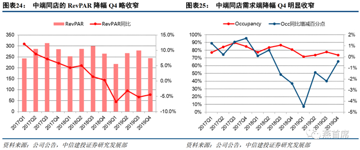 公司全部酒店口径的平均房价和RevPAR在2019Q4的降幅均进一步扩大,符合酒店行业目前仍在底部周期的判断,但Q4全部门店需求端的同比降幅环比出现较明显的收窄,从需求端看有逐渐企稳的趋势。