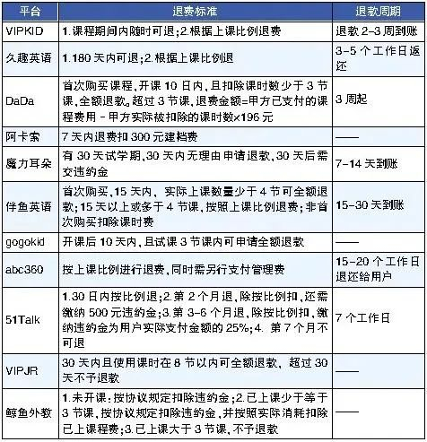 至于退款到账周期,阿卡索在7天内退款,需扣300元建档费;51Talk则是在第2个月以后退;此外,VIPKID、久趣英语、DaDa等平台也明确说明了退款周期。