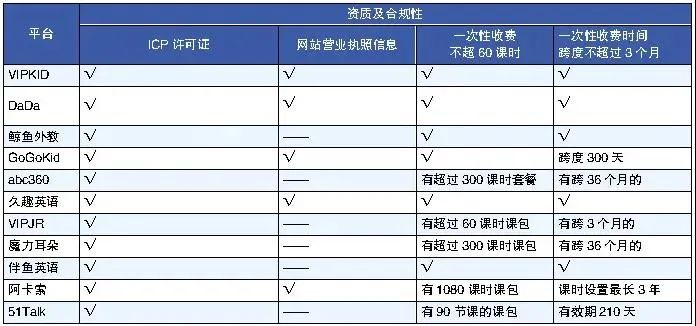 调研发现,VIPKID、DaDa英语、鲸鱼外教、久趣英语及伴鱼英语在课时、收费跨度上均符合意见要求;GoGoKid、abc360、51Talk、魔力英语、VIPJR、阿卡索等平台存在一次性收费时间跨度超过3个月或3个月到12个月时间,甚至包括三年的套餐,在课时多少、收费时间跨度上不符合规定。