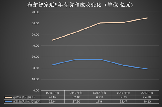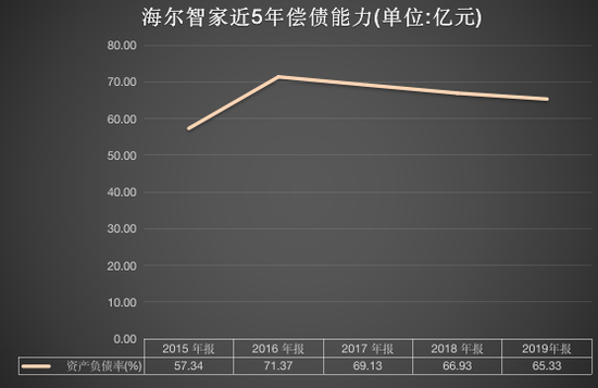 在现金流方面,2019年海尔智家经营活动产生的现金流量净额为150.83亿元,期末现金余额349.63亿元,资产负债率连续三年下降,2017-2019年分别为69.13%、66.93%和65.33%。