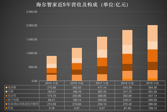 与其他家电龙头企业相比,海尔智家坚持智慧家庭引领的战略方向,正全面布局物联网生态。2019年空调收入291.12亿元,同比减少8.3%;电冰箱收入584.37亿,同比增长7.5%;厨电收入295.09亿元,同比增长18.3%;水家电收入96.24亿元,同比增长5.8%;洗衣机收入447.14亿元,同比增长23.3%;装备部品及渠道综合服务收入280.6亿元,同比增长4.5%。