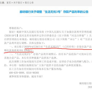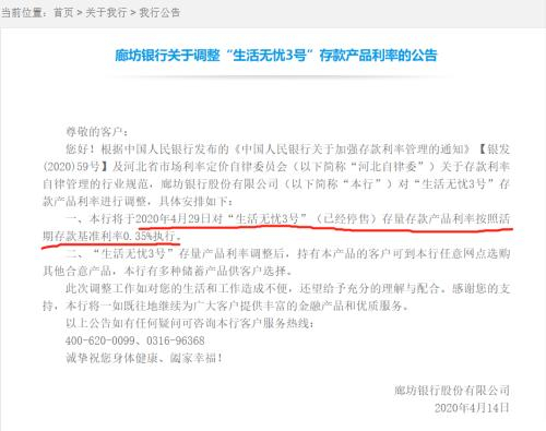 4月14日,廊坊银行发布公告称,将从4月29日对“生活无忧3号”(已经停售)存量存款产品利率按照活期存款基准利率0.35%执行。上述提到的产品便是靠档计息的智能存款产品。不过由于该公告引起的争议较大,随后廊坊银行删除了该公告。