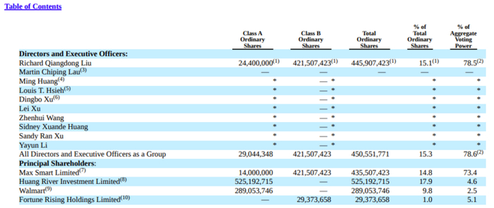 根据京东集团向美国 SEC 提交的 2019 年年报,京东第一大股东腾讯持股 17.9%,刘强东作为第二大股东持有京东 15.1% 的股权,第三大股东沃尔玛持股 9.8%。但是,在同股不同权架构下,刘强东拥有 78.5% 的投票权(计及一致行动人为 78.6%),腾讯只有 4.6%,沃尔玛只有 2.5%。