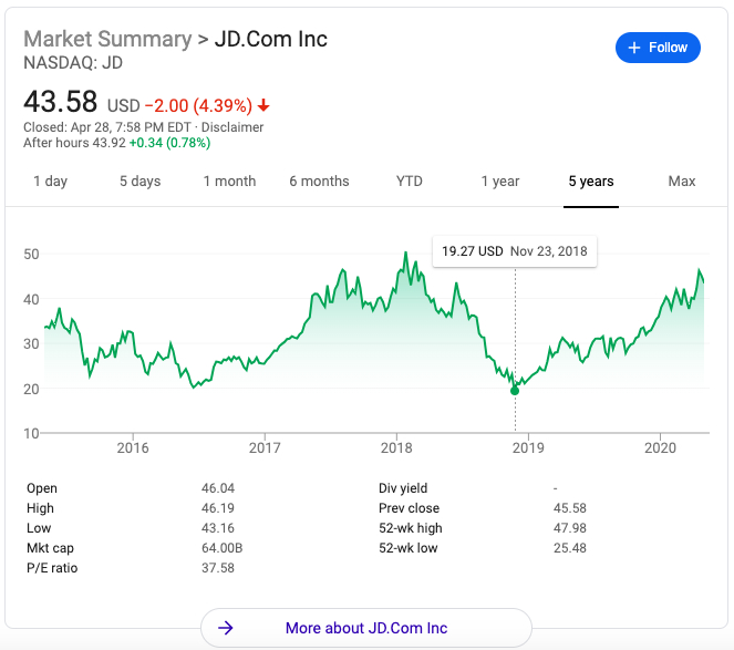 按照 4 月 28 日美股收盘价计算,京东当前的股价,已经比年初上涨了 23.7%。
