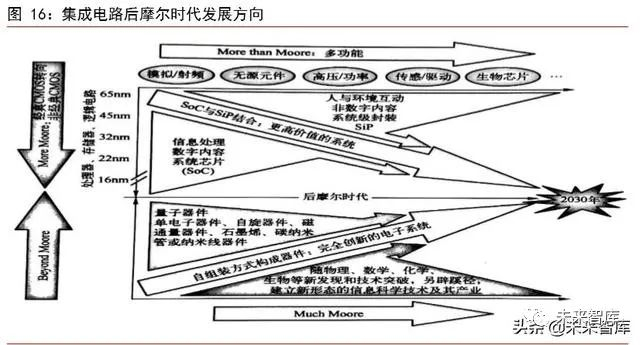 总结:摩尔定律是一个基于集成电路实际生产所得出来的结果。随着集成电路尺寸不断减小,技术瓶颈在制约工艺的发展,当前产品换代速度已下降,因此,需要重新确认集成电路的发展方向。目前,业界已提出四大发展方向,延续摩尔(More Moore)、扩展摩尔 (More than Moore)、超越摩尔(Beyond Moore)、丰富摩尔(Much Moore)。从技术的角度看,超越摩尔和丰富摩尔这两大方向突破尚需时日;在技术上获得突破后,在从商业上实现量产,或许是多年后的事情。从两大因素来看,超越摩尔和丰富摩尔这两大方向目前尚未出现确定趋势。然而,以小尺寸 SOC 为代表的延续摩尔,以及以 SIP技术为代表的扩展摩尔,以目前的技术,相对于超越摩尔和丰富摩尔这两大方向,是较为容易突破于实现,从商业的角度业也有望实现量产。因此,从技术角度,以小尺寸 SOC为代表的延续摩尔,以及以 SIP 技术为代表的扩展摩尔,将会是未来一段时间集成电路产业的发展趋势。