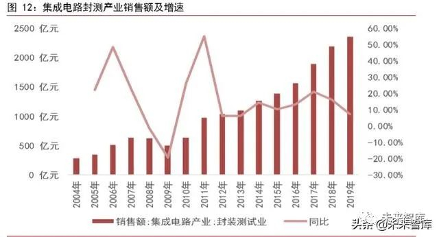 封测业技术壁垒较低,追赶速度较好。集成电路封装属于集成电路产品制造的后序工序,整体伴随着集成电路芯片技术的不断发展而变化。封装的主要作用是提供对芯片的支撑与机械保护,为了剔除不合格品而进行标准的各种测量与筛选的过程为测试。由于封装测试领域技术壁垒相对较低,人力成本要求相对较高。在我国,集成电路封装测试业发展形势较好,占比在集成电路产业中始终保持在 35-40%左右。整个产业由 2004 年的282.60 亿元增至 2019 年的 2349.7 亿元,在 2004-2019 年产业规模的年均复合率达到15.17%。在未来,物联网将是推动半导体市场增长的主要动力。由于物联网产品比手机更强调轻薄短小,因此,完整的系统封装与系统模组整合能力将是封测企业的发展方向。