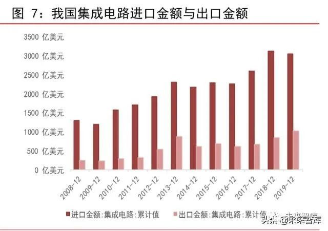 我国集成电路产业高度依赖进口。我国集成电路进出口规模随着电子信息产业的迅速发展和集成电路市场需求的不断增长也在快速扩大。2008-2019 年中国集成电路进口量和进口额从 1354 亿块和 1292.6 亿美元到 4451.34 亿块和 3055.5 亿美元。同期中国集成电路出口量和出口额则从 2008 年的 485 亿块和 243.2 亿美元到 2019 年的 2186.97 亿块和 1015.8 亿美元。可以看出出口与进口保持了同步增长的势头,但集成电路领域整体贸易逆差绝对值仍在快速扩大,从 2008 年的 1049 亿美元贸易逆差额扩大到 2040 亿美元,可以看出随集成电路仍依赖进口。