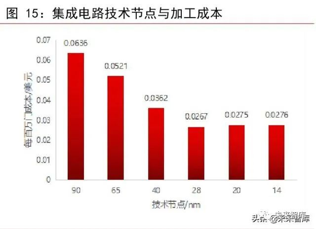 物理、功耗和经济成集成电路工艺发展瓶颈。集成电路性能、功耗及制造成本是评判摩尔定律是否有效其中较为重要的标准。目前主流芯片厂商的产品已经进入到10nm以内,遵循过往方法,即按比例不断缩小各元件尺寸已无法达到摩尔定律所指导的目的。从物理角度来看,集成电路尺寸已进入到介观尺寸材料的范围内,各种物理障碍都会成为集成电路发展的阻力,如杂质涨落、量子隧穿等。介观物理和基于量子化的处理方法是解决这些物理障碍的有效手段。但目前而言,这些技术在商业化上还尚未成熟,这将制约集成电路发展的一大因素。时钟频率是评估芯片性能的一个重要指标,其数值越大,性能越佳。因而,时钟频率的提升是在每个技术节点厂商都需要考虑的问题。但是钟频率提高的同时,功耗也会随之上升。目前每一技术节点在时间频率上都会有 20%的提升,而功耗也以一定的速率在增加。若将功耗保持在一个固定数值,即使是技术节点在不断的向前推进,时钟频率也得不到提升,甚至在某一节点开始下降。散热问题是功耗上升后所要面临的一大难题,在技术节点不断下探的情况下,如何保证芯片在合理的工作温度运行考验着各大厂商。功耗和性能的平衡点需要不断的探寻,因而功耗成为另外一个制约集成电路发展的因素。所有工艺和技术的最终落脚点都是利润。从成本的角度来看,20nm 成为加工成本的一个分水岭。在 20nm 以前的技术节点,加工成本都有一定的下降。但从 20nm 开始,加工成本下降的趋势被打破,开始有所上升。成本的增加挤压厂商的利润,在一定程度上将打击研发的热情,研发速度将有所放缓。物理制约、功耗制约和经济制约是现阶段对摩尔定律应用限制较为明显的因素,因此,当前需要重新确认集成电路的发展。