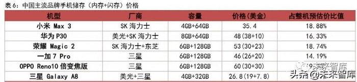 储存与基带芯片价格占比高,国产替代可期待。2019 年 4 月 30 日,摩根大通发布一份报告指出,根据美国投资银行的数据,5G 手机芯片将比 4G 同类产品贵出约两倍。从此 表述中,我们推断相关芯片价值是有所提升的。华为 P30 是今年初所发布的华为 P 系列4G 手机旗舰机型,我们通过拆解寻源 P30 相关组件为例子,来初步估算一下 5G 芯片的 价值。P30(8GB+64GB)整机预估价格为 293.93 美金,其中主控芯片估价为 127.78 美金,占整机估价约 43.47%。在主控芯片中,属于基带处理器的麒麟 980 处理器价值最高为 60 美金,其次为储存(闪存+内存)48 美金,分别占整机估值约 20.41%和 16.33%,占主控芯片估值约 46.96%和 37.56%。根据摩根大通报告的观点进行估算,5G 手机终端的处理 器价格约在 120 美金左右。截至 2019 年 2 月,在各大厂商所发布的 5G 芯片中,仅有四款芯片适用于中国 5G 规划,分别为骁龙 855、巴龙 5000、Helio M70 和春藤 510。在 5G 技术下,可选芯片数量少和芯片价值提升将会提升厂商毛利。与此同时,在美国限制通信芯片出口的背景下,国产芯片将会迎来需求增加的利好局面。手机运行流畅程度除芯 片影响外,其储存容量的大小也是一个不可忽略的因素。从各主流机型内存组合和价格来看,即使是型号、容量和制造厂商有所不同,但其占整机预估价比值都超过 10%,个 别机型甚至接近 20%。在未来,由于信息习惯的变化,5G 使用的应用将会增加,产生的数据量会再上一个级别,因此消费者对手机闪存与内存的规格将会进一步提升,存储在 手机中单体价值将将会提升。随着手机换机潮所带动出货量的上升,手机内存的需求量有望上升。