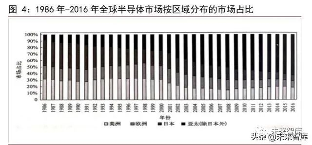 世界集成电路重心已从欧美转向亚太地区。1986 年,全球半导体市场按区域分布的市场占比区分,日本市场是最大的区域市场,占全球半导体市场的 39.7%,而此时亚太(除日本外)市场仅占 7.8%。进入 21 世纪后,亚太(除日本外)市场持续保持快速增长。2000 年,日本市场占全球市场的比例下降至 22.9%,较 1986 年下降了 16.8%;与此同时,亚太(除日本外)地区市场已经快速增长至达到 25.1%的占比,成为仅次于美洲地区的第二大区域市场,此时,美洲和欧洲地区市场分别占全球市场 31.3%和 20.7%。随着技术的发展,亚太地区(除日本)的半导体生产研发技术不断进步,半导体生产体系日益完善,半导体生产重心已经转移至亚太(除日本)地区;同时,进入 21 世纪后,亚太(除日本)地区对经济水平获得快速发展,人们消费能力进一步提升,对半导体产品需求增加,因此,世界半导体市场中心也转移至亚太地区。2016 年,亚太(出日本外)地区市场已占全球市场 61.5%,成为全球最大的半导体市场地区。