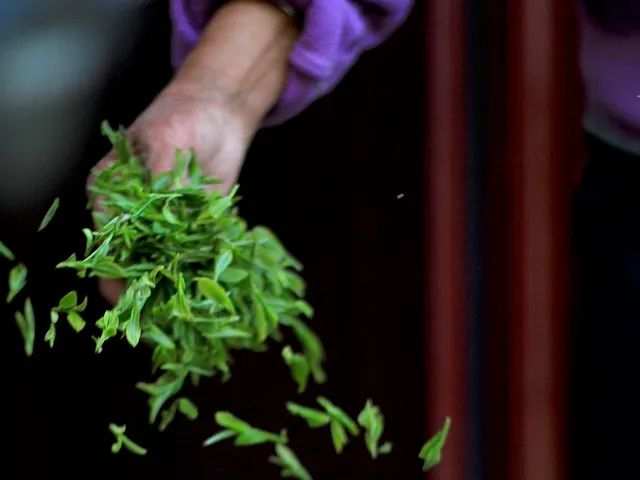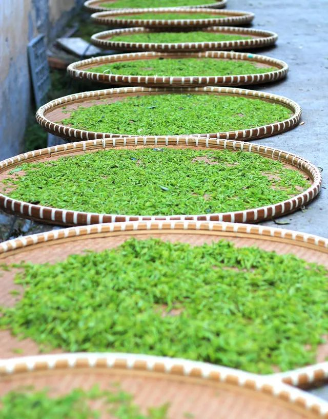 采完的新鲜茶叶放入晾筛中摊放,让其自然萎凋,蒸发茶叶中的水分,使鲜叶呈现萎蔫状态。