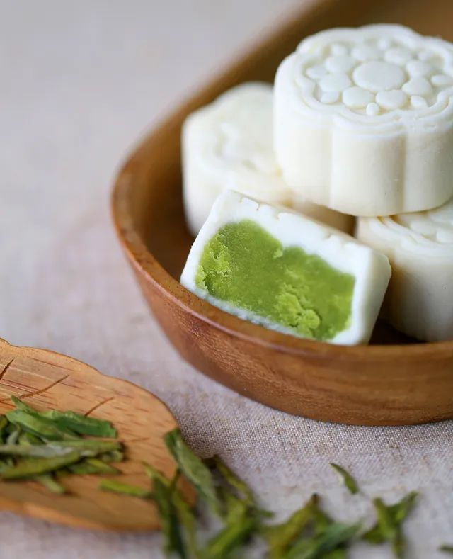 刚刚炒制出来的龙井,用石磨碾成极细的茶粉,拌入细腻的芸豆泥中,加少许砂糖,就制成了这独一无二的“龙井内馅”。
