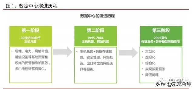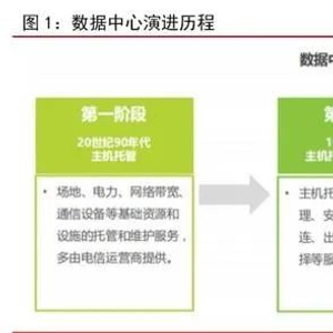 数据中心(即 IDC:Internet Data Centre)是为计算机系统(包括服务器、储存和网络设备等)安全稳定持续运行提供的一个基础设施。从数据中心全生命周期角度,数据中心服务商向客户提供包括数据中心前期的规划设计、建筑,以及后期运维等多个服务。其中,数据中心的运维服务包括服务器托管、数据备份等多项增值服务。目前,数据中心正处于发展的第三阶段,通过引入云计算技术,逐步走向大型化、虚拟化、综合化,服务内容、服务形式逐渐扩展。
