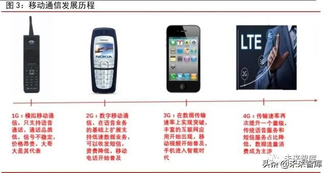 我国 2013 年迈入 4G 时代,流量消费成为主流。从通信技术发展历程看,移动通信大约每十年经历一次标志性技术革新:1G 到 2G 实现模拟通信到数字通信的转变,手机在该阶段开始普及;3G 在数据能力上实现突破,峰值速率可达 2Mbps 到数十 Mbps,移动多媒体业务开始发展;4G 的传输能力再次提升一个量级,峰值速率可达 100Mbps 至 1Gbps,为移动互联网的快速发展奠定了基础。2013 年,工信部向中国移动、中国联通、中国电信三大运营商发放 TD-LTE 牌照,标志着我国正式进入 4G 时代。在此阶段,包括移动游戏、短视频、移动支付等多个娱乐及生活类热门 APP 广泛应用,移动互联网业务快速发展,移动数据流量消费在该阶段成为主流。