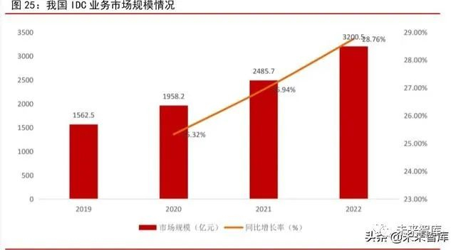 总结:随着国内 5G 商用进程不断推进,在高速率、低时延、高可靠的网络支撑下,2C/2B端应用迎来发展的黄金时期,数据流量将迎来新一轮的爆发期,对数据中心的需求将陆续得到释放。同时,我国云计算的发展正处于快速上升期,新冠疫情的扰动亦有望进一步加速企业上云的进度,对数据中心等 IaaS 基础设施的需求将逐渐加大。自 2019Q3 以来,国内云计算巨头以及通信运营商不断加大云计算领域的投资,数据中心作为底层设施将直接受益。未来,在 5G+云计算双逻辑的驱动下,数据中心产业链景气度有望持续向好。据科智咨询预测,到 2022 年,我国数据中心业务市场规模将达到 3200.5 亿元,2019-2022 年均复合增长率高达 27.0%。