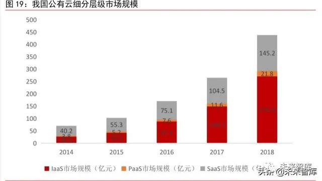 分层级来看,IaaS 占据公有云市场主要份额。2018 年我国公有云 IaaS 市场规模达到270.4 亿元,同比增长 81.8%,2014-2018 年均复合增长率达到 79.24%。PaaS、SaaS 市场规模分别为 21.8 亿元和 145.2 亿元,分别同比增长 87.9%和 38.9%;2014-2018 年均复合增长率分别为 54.76%和 37.86%,CAGR 增速均低于 IaaS 层。