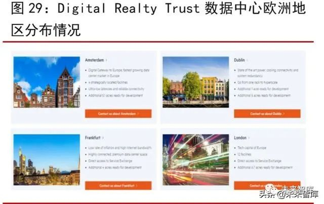 目前,海外数据中心多沿发达城市布局。从国际第三方IDC龙头的区位选择来看, Equinix与 Digital Realty Trust 两者在全球均拥有超过 200 间数据中心,且旗下的 IDC 基本围绕一线城市布局。以欧洲地区为例,Equinix 在伦敦、巴黎、苏黎世、法兰克福等经济发达的城市均有布局,而 Digital Realty Trust 则集中布局在伦敦、阿姆斯特丹、都柏林、法兰克福等四个主要城市。