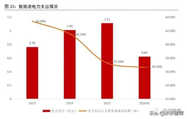 数据中心运营支出主要由电费构成。数据中心总体成本(TCO)分为固定资产支出(CAPEX)和运营支出(OPEX)。固定资产支出主要指数据中心前期的建设投资以及一段期限折旧后的再投资,运营支出则为每月运行设备所花费的成本,包括电费、维修及保养费用等。数据中心由于全天候处于运行状态,除了需要充足的电力供给保证服务器、交换机等 IT设备正常运行,还需要长期运行机房的散热设备,对机房进行持续不断的物理降温。因此,电费支出成为了数据中心运营支出的主要部分。据数据港招股说明书显示,2013 年公司电力支出占当期营业成本的比例达到 63.39%,随后 2014、2015 及 2016H1 的电力支出占比虽有所下降,但仍保持在 50%以上。由于数据中心对电力的需求较大,在一定程度上为高能耗产业。