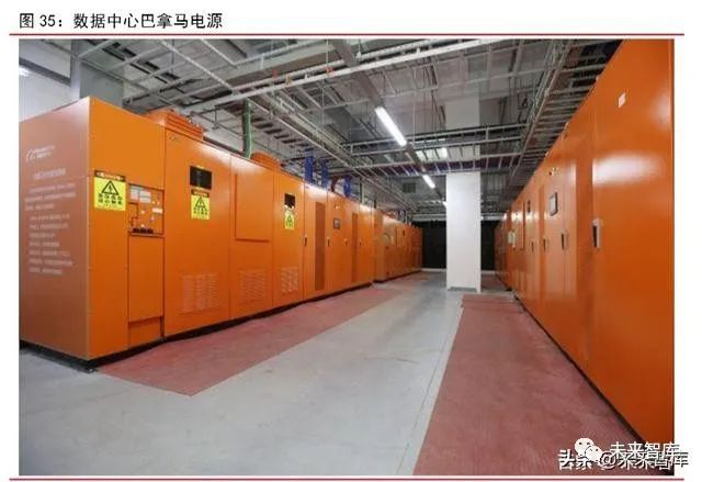 支持性设备包括土地、通信网络、电源、散热、机架等。对于电源来说,目前 UPS 占主流,HVDC 有望逐步替代。传统数据中心主要以“UPS+市电”作为供电方案,相关厂商包括华为、科华恒盛、易事特等。与 UPS 需要多次整流及自流逆变相比,HVDC 整流次数较少,在损耗上较 UPS 大幅降低。据信通院数据显示,“HVDC+市电直供”的供电效率能够提升到 94%到 95%。同时,HVDC 正走向高度集成化,有望进一步降本提效。2019 年 11月,阿里发布巴拿马电源方案,提出最高 2.5MW、一体化、模块化、高效、高可靠直流不间断电源,省去传统低压配电环节,与传统数据中心的供电方案相比,减少 50%的占地面积,同时集成化进一步提高了部署效率。预计未来高度集成化的 HVDC 将成为新数据中心主流的电力方案。HVDC 相关厂商包括中恒电气、台达、动力源等。另外,数据中心还需配备一定数量的柴油发电机作为备用电源,保证断电后 IT 设备仍能正常运行,相关厂商包括康明斯、卡特彼勒等。