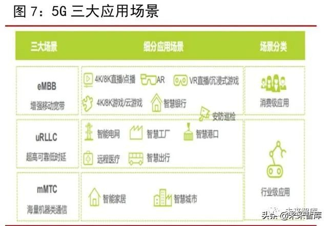 国际电信联盟 ITU 将 5G 的三个主要应用场景定义为:增强移动宽带(eMBB)、超高可靠低延时通信(uRLLC)以及海量机器类通信(mMTC)。其中,eMBB 面向 2C 领域,主要包括 4K/8K 超高清视频、AR/VR 等消费级应用;uRLLC 则面向 2B 领域,主要包括自动驾驶、远程医疗等行业应用。随着韩国在 2019 年 4 月率先实现 5G 商用后,美国、瑞士、意大利等多个国家陆续提供 5G 商用服务。2019 年 6 月,工信部正式向三大运营商以及中国广电发放 5G 牌照,牌照发放时间超市场预期;11 月,国内 5G 商用正式开启,首批50 个城市率先铺开。