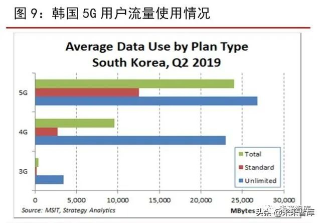 2C:应用内容丰富,韩国地区流量率先爆发,我国有望复制经验。2019 年 4 月,韩国在全球率先开启 5G 商用;6 月,韩国 5G 用户累计已达 134 万人次。从韩国运营商推出的5G 套餐来看,KT、SKT、LG U+等三大运营商均有针对各自的 5G 套餐提供多个增值内容,包括云游戏、高清视频、赛事直播、AR/VR 等方面。以 KT 赛事直播应用为例,通过eSportsLive,用户不仅可以观看 LCK、PKL 等游戏的实时直播,还能够在一个画面中同时播放 5 个高清视频。在多个“烧流量”应用的推动下,韩国 5G 用户数据使用量呈井喷式爆发。据 MSIT、Strategy Analytics 数据显示,2019 年 6 月,5G 用户的平均数据使用量达到 24GB,是 4G 用户平均使用量的 2.6 倍、韩国整体市场使用量的 3.2 倍,数据流量大幅增长。