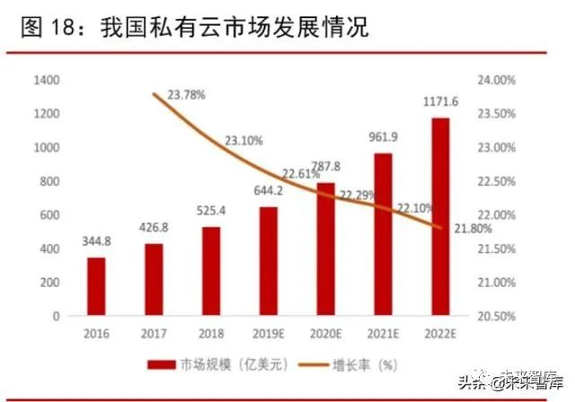 我国公有云市场保持高速增长。2018 年,我国云计算市场整体规模 962.8 亿元,同比增长 39.2%,增速显著高于全球平均水平。其中,公有云市场规模为 437.4 亿元,同比大幅增长 65.18%,预计 2022 年市场规模有望达到 1731.3 亿元。私有云市场规模为 525.4亿元,同比增长 23.10%,预计 2022 年市场规模将为 1171.6 亿元。总体来看,与欧美发达国家相比,我国云计算市场起步较晚,市场提升空间巨大,预计未来几年仍将保持快速增长。