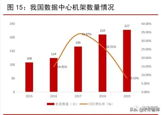 面对日益增长的数据流量,近年来我国不断加大数据中心的投资及建设力度。据赛迪顾问数据,2019 年我国数据中心 IT 投资规模达到 3698.1 亿元,较 2018 年增加超 400 亿元,并预计 2025 年支出将高达 7070.9 亿元。从数量上来看,2019 年我国数据中心的数量接近 7.4 万个;机架数量达到 227 万架,较 2016 年的 124 万架增长超 80%,2016 至2019 年的复合增长率达到 22.33%。随着 5G 商用进程持续推进,2C/2B 端应用迎来发展的黄金时期,数据流量将迎来新一轮的爆发期,对数据中心的需求将陆续得到释放。