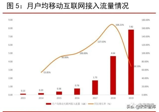 用户流量需求日渐旺盛,数据流量进入爆发期。2013 年作为 4G 开通元年,全国移动互联网接入流量仅为 12.7 亿 GB,人均每月移动互联网接入流量为 0.13GB。4G 开通的第二年,2014 年全国移动互联网接入流量、人均每月移动互联网接入流量分别达到 20.6 亿GB 和 0.20GB,同比分别大幅增长 62.20%和 53.85%。随着 4G 网络渗透率的不断提升,移动网络用户的基数不断扩大;同时,高速网络催生多个热门移动应用,用户对流量需求日渐旺盛。2019 年,全国移动互联网接入流量达到 1220 亿 GB,2013 至 2019 年年均复合增长率达到 114.01%;人均每月接入移动流量 7.82GB,2013 至 2019 年年均复合增长率高达 97.94%,增长幅度显著。
