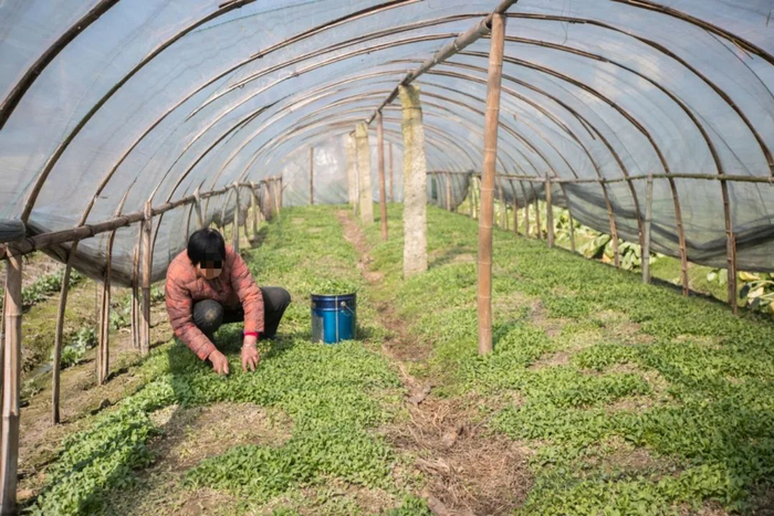 2018年2月23日,浙江省绍兴市上虞区一乡村,大棚种植野菜“马兰头”,价格比肉贵