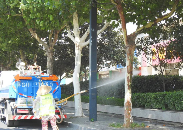 2018年8月3日,江苏连云港海州区朝阳路,绿化工作人员在喷洒农药防治美国白蛾