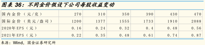 由于金价对公司业绩影响大,我们对金价与公司EPS进行敏感性分析(假设美元对人民币为7)。当国内金价跌至270元/克(1200美元/盎司)时,2020-2021年EPS 为 0.16元/0.22元;当国内金价涨至470元/克(2088美元/盎司)时,2020-2021年EPS 为 0.56元/0.87元。