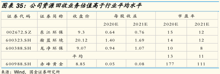 我们选取东江环保、瀚蓝环境、龙净环保等国内A股上市的环保公司作为可比公司,采用市盈率相对估值法对赤峰黄金资源回收业务进行估值。根据Wind一致预期,可比公司2020年平均估值为13倍。