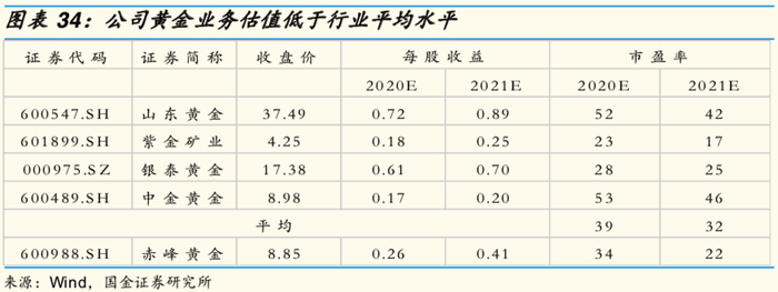 我们选取山东黄金、紫金矿业、中金黄金等国内A股上市的黄金矿山企业作为可比公司,采用市盈率相对估值法对赤峰黄金矿山采选业务进行估值。根据Wind一致预期,可比公司2020年平均估值为39倍。
