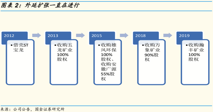 自2012年借壳上市以来,公司本着外延式发展的战略持续进行并购。2013年发行股份购买五龙矿业100%股权,交易金额6.26亿元;2015年发行股份购买雄风环保100%股权并募集配套资金,交易金额9.06亿元;2015年支付4000万元现金并增资6000万元取得广源科技55%股权;2018年现金收购LXML(万象矿业)90%股权,交易金额17.79亿元;2019年发行股份购买瀚丰矿业100%股权并募集配套资金,交易金额5.1亿元。