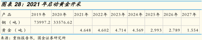 3) 矿产金和矿产铜产量:预计2020-2021年境内矿产金产量2.23吨/2.23吨,2020-2021年境外矿产金产量2吨/4.65吨,2020年境外矿产铜产量40000吨。