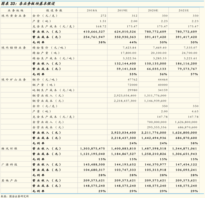1) 金属价格:假设2020-2021年国内黄金均价350元/克,较2019年上涨12%;选取2020年一季度国内铜均价44464元/吨作为2020年铜价预测基础,较2019年下跌7%。