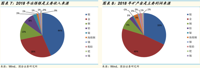 按照产品划分,银(冶炼业务)是公司2018年主要的收入来源、金(采矿业务)是主要的利润来源;按照板块划分,资源回收板块(除金和铜外的产品)是公司2018年主要的收入来源,采矿业务(金和铜)是公司主要的利润来源。由于公司暂未披露2019年年报,我们预计采矿业务是公司2019年主要的收入和利润来源。