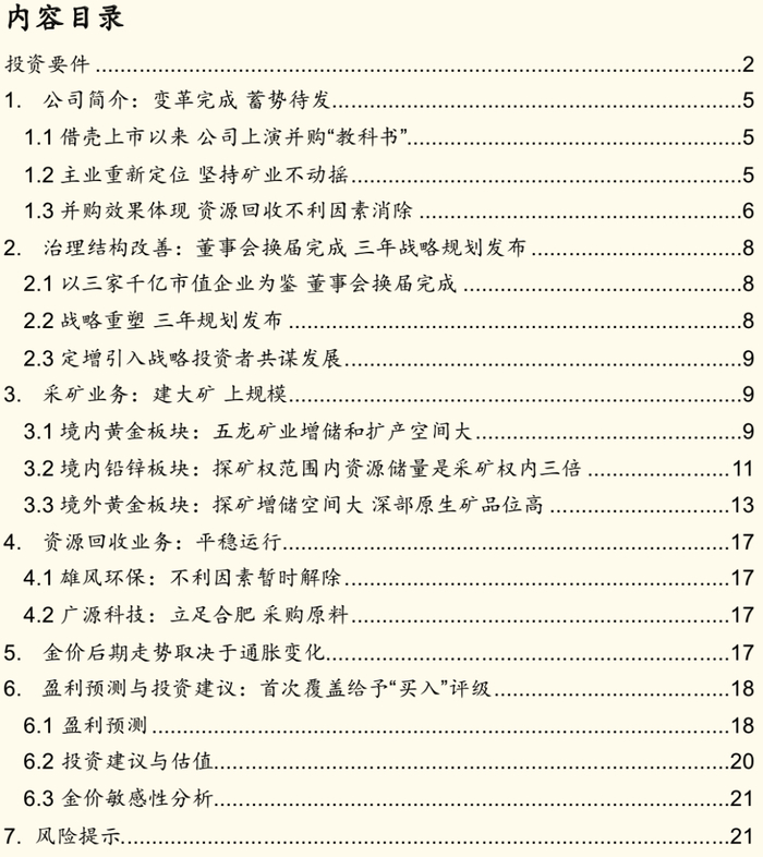 董事会换届完成,三年发展战略公布:自2012年借壳以来,公司本着外延式扩张战略实现了收入和利润的增长。2019年董事长变更为曾执掌三家千亿市值企业的王建华,依托其在黄金行业的经验,公司将主业定位于以黄金采矿为主。在双业务模式下,资源回收业务平稳运行,增长源于采矿业务。