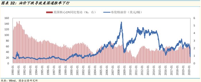从历史上看,油价与美国通胀率的关联度高。2000 年美国互联网泡沫破灭,油价在 2000 年中期见顶后出现回落,美国通胀率在 2000 年末见顶后下滑;2008 年美国次贷危机时,油价出现大幅下跌,美国通胀率在 2008 年三季度见顶后出现回落。2020 年一季度,受新冠肺炎疫情影响,布伦特原油从年初以来最大跌幅 65%,美国核心 CPI 在 2020 年 3 月份出现回落。