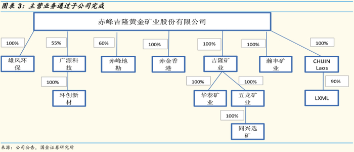 公司的业务主要通过子公司完成。吉隆矿业、华泰矿业(吉隆矿业的全资子公司)、五龙矿业从事境内黄金采选业务,LXML从事境外铜和黄金采选业务,瀚丰矿业从事境内铅锌采选业务;雄风环保和广源科技属于资源回收行业,雄风环保从事有色金属资源综合回收利用业务、广源科技从事废弃电器电子产品处理业务。