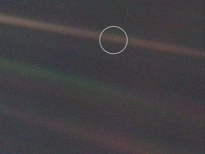 这张照片就是后世所传的“黯淡蓝点”( Pale Blue Dot) 。照片中, 地球如一粒闪光的微尘,漂浮在无垠太空中。