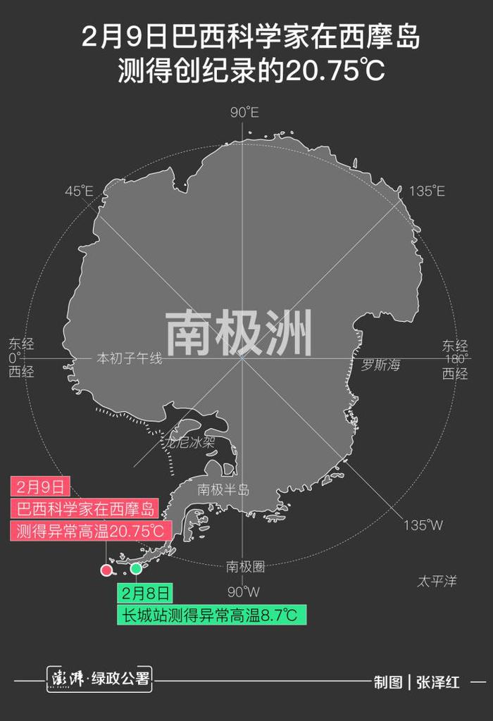 这次测到高温数据的西摩岛就位于南极半岛附近,甚至在南极圈之外,历史最高纪录为19.8℃,这次高了近1℃。而在与西摩岛相距不远的我国南极第一站长城站,2月8日下午3点也测得近期高温8.7℃(长城站记录的历史最高气温为1989年观测到的11.7℃)。